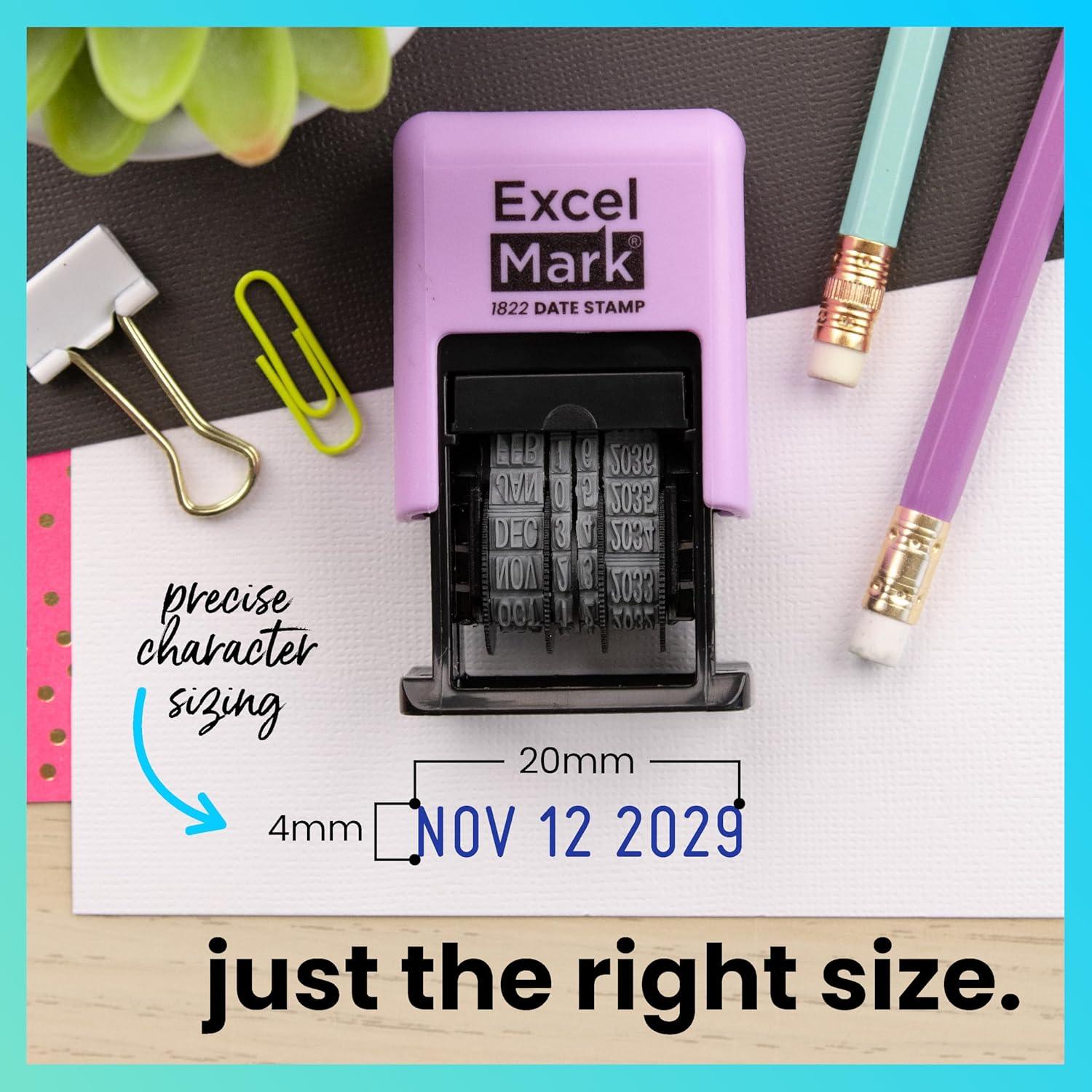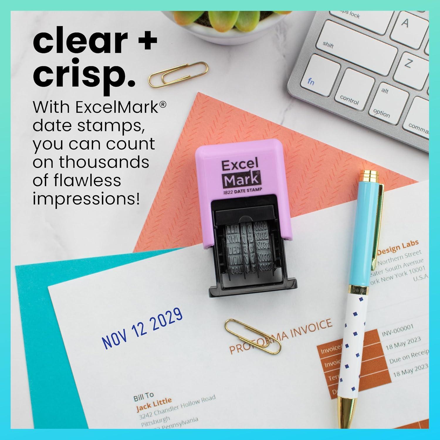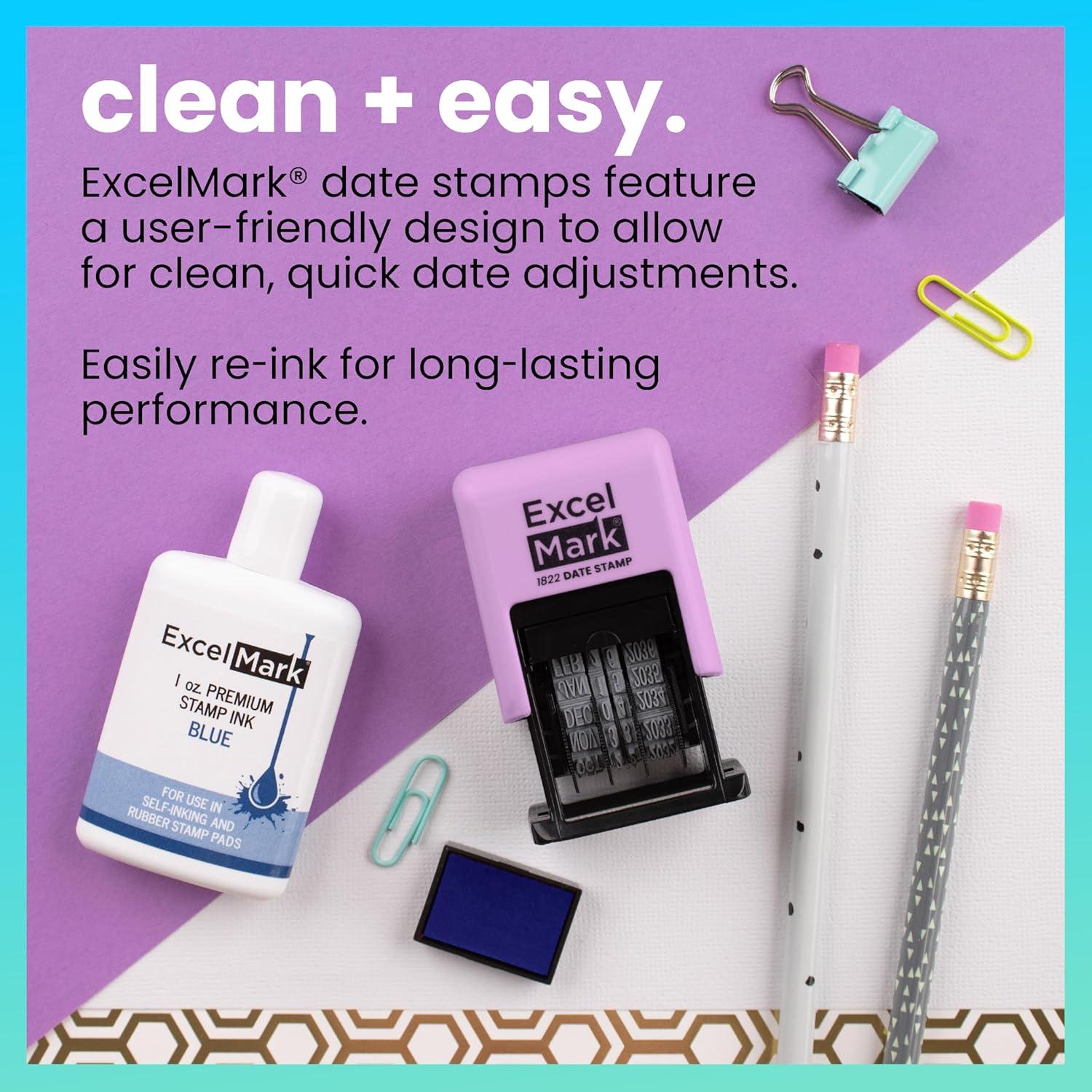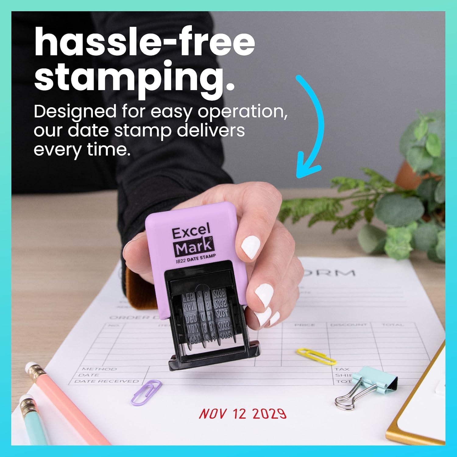 DATE STAMP – ExcelMark's new date stamp offers a better quality stamp than most daters. With 10 years worth of dates, this stamp is expected to last for a long time. To change the date, simply press the base down and turn the black dials to keep your fingers mess free!