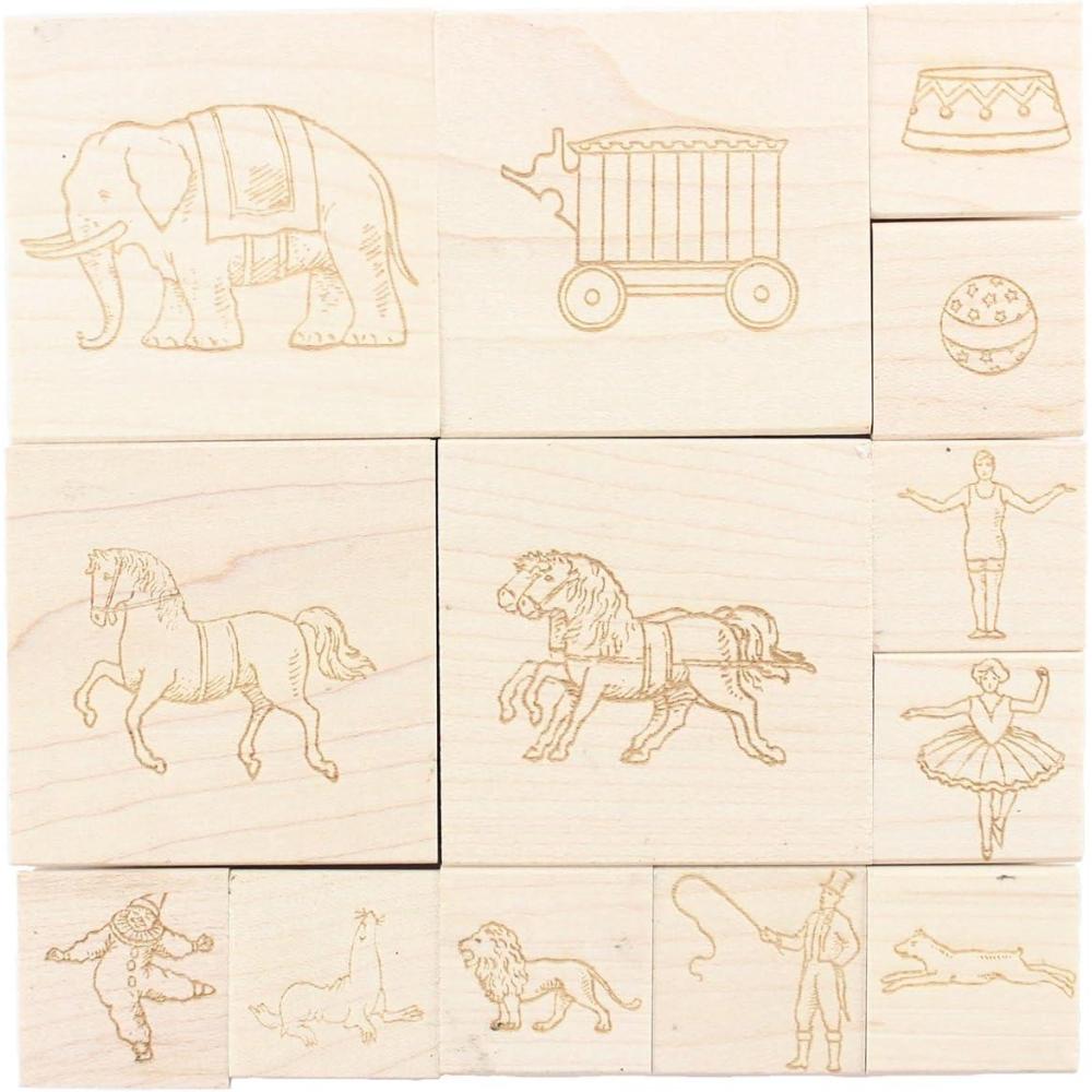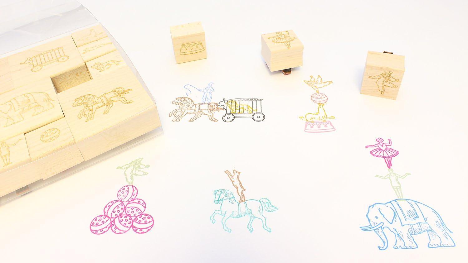 13-piece stamp set includes: elephant (2″x 2″), carriage (2″x 2″), podium (1″x 1″), ball (1″x 1″), horse (2″x 2″), double horse (2″x 2″), acrobat (1″x 1″), ballerina (1″x 1″), clown (1″x 1″), seal (1″x 1″), lion (1″x 1″), lion tamer (1″x 1″), and dog (1″x 1″)
