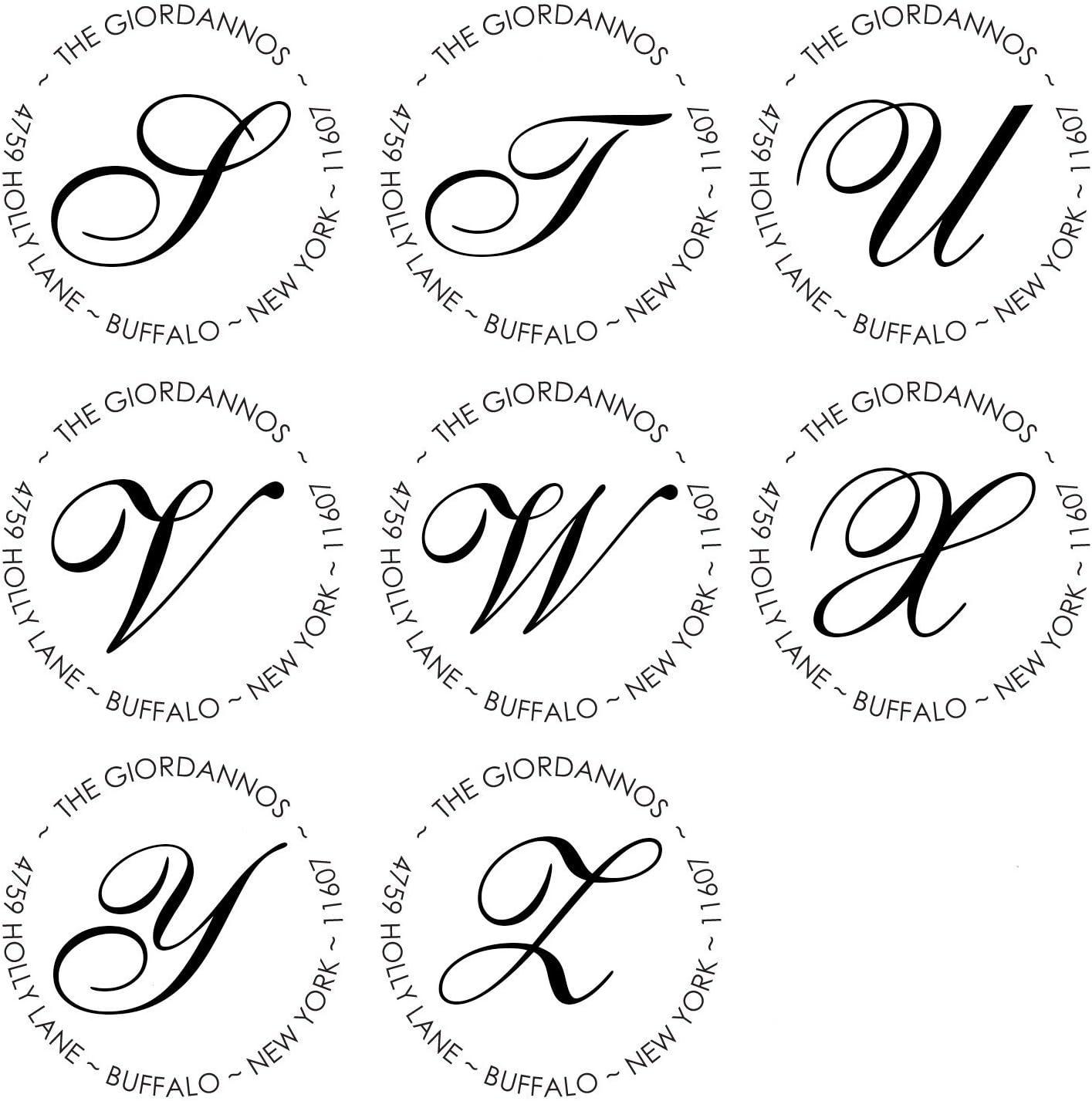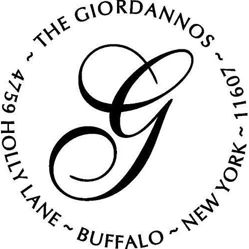 A custom self inking address stamp personalized with your name and address in the font and style shown, along with your monogram in an elegant cursive font