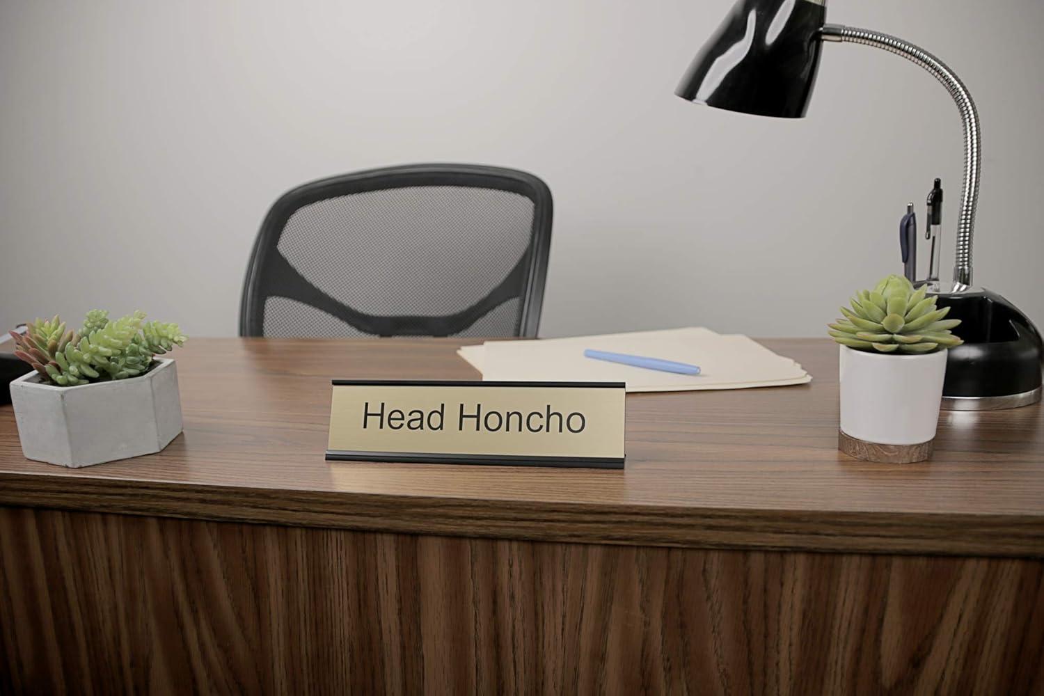 ExcelMark Head Honcho Desk Plate – 2″x 8″Novelty Name Plate – Gold Name Plate with Black Desk Holder