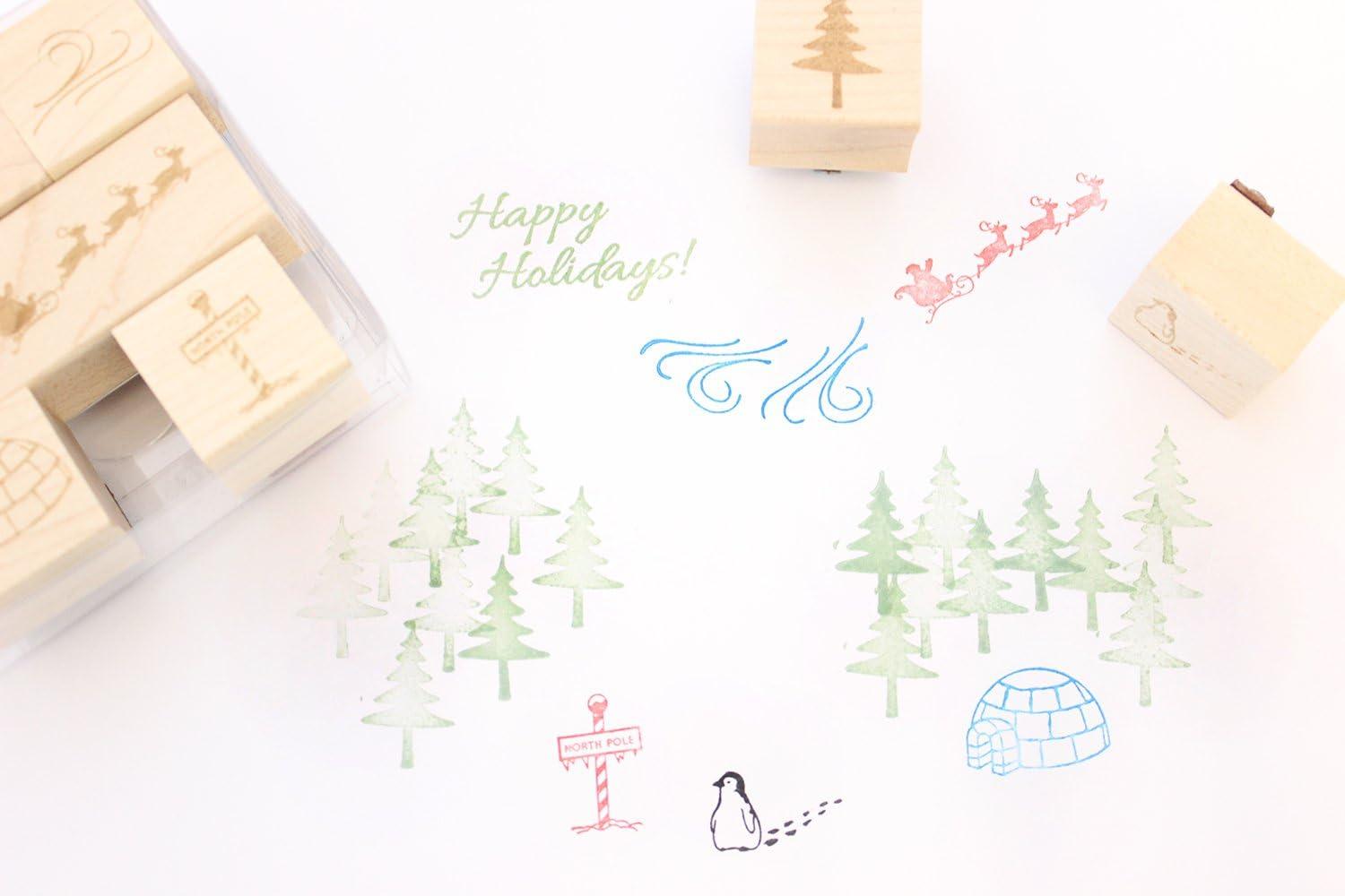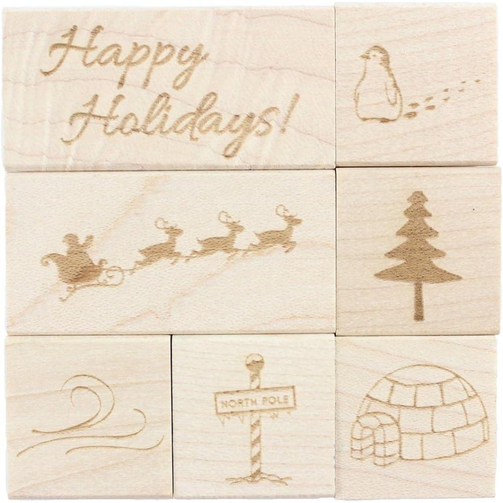 7-piece stamp set includes: “Happy Holidays!”(1″x 2″), penguin (1″x 1″), Santa's sleigh (1″x 2″), pine tree (1″x 1″), wind (1″x 1″), North Pole sign (1″x 1″), and igloo (1″x 1”)