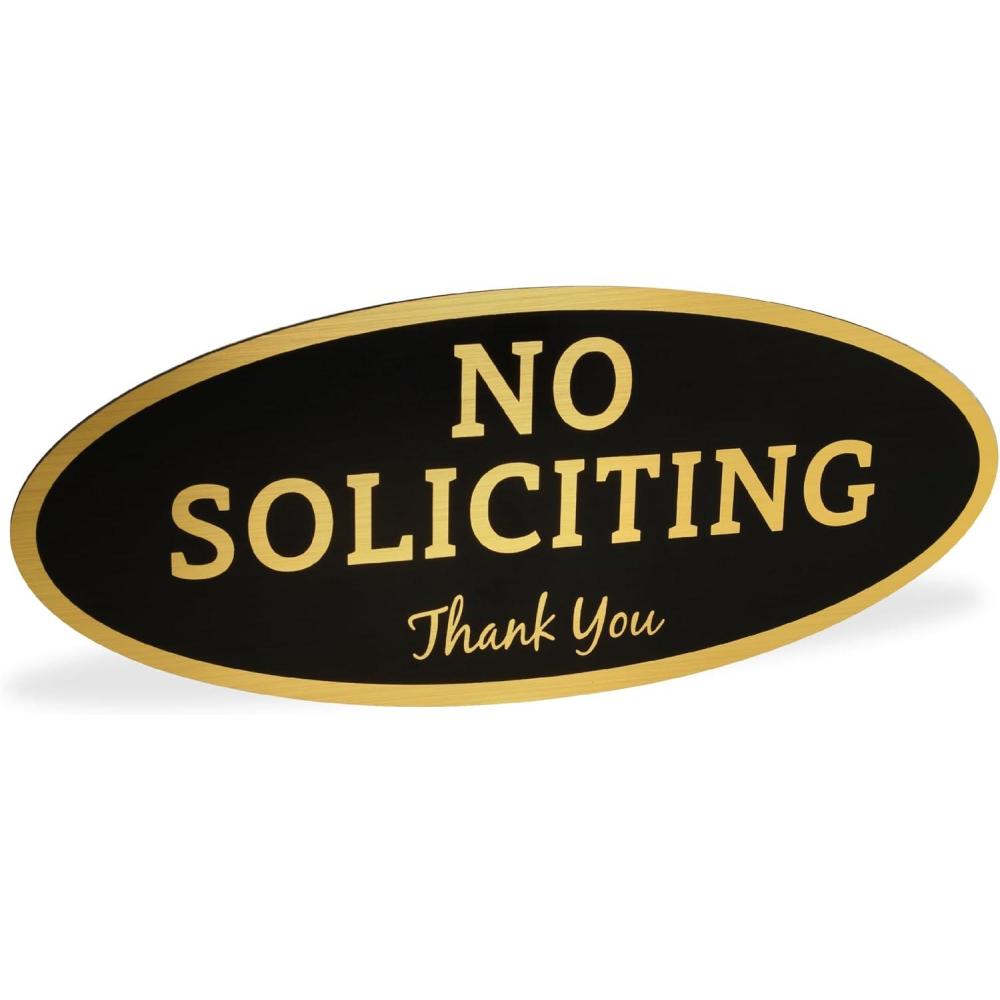 imageExcelMark No Soliciting Sign for House or Business  Durable IndoorOutdoor Sign  Easily Attach to Front Door  UV and Weather Resistant Small  2quotx 5quot Black with Gold LettersBlackGold Oval