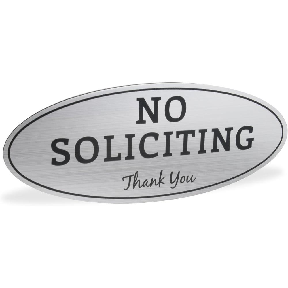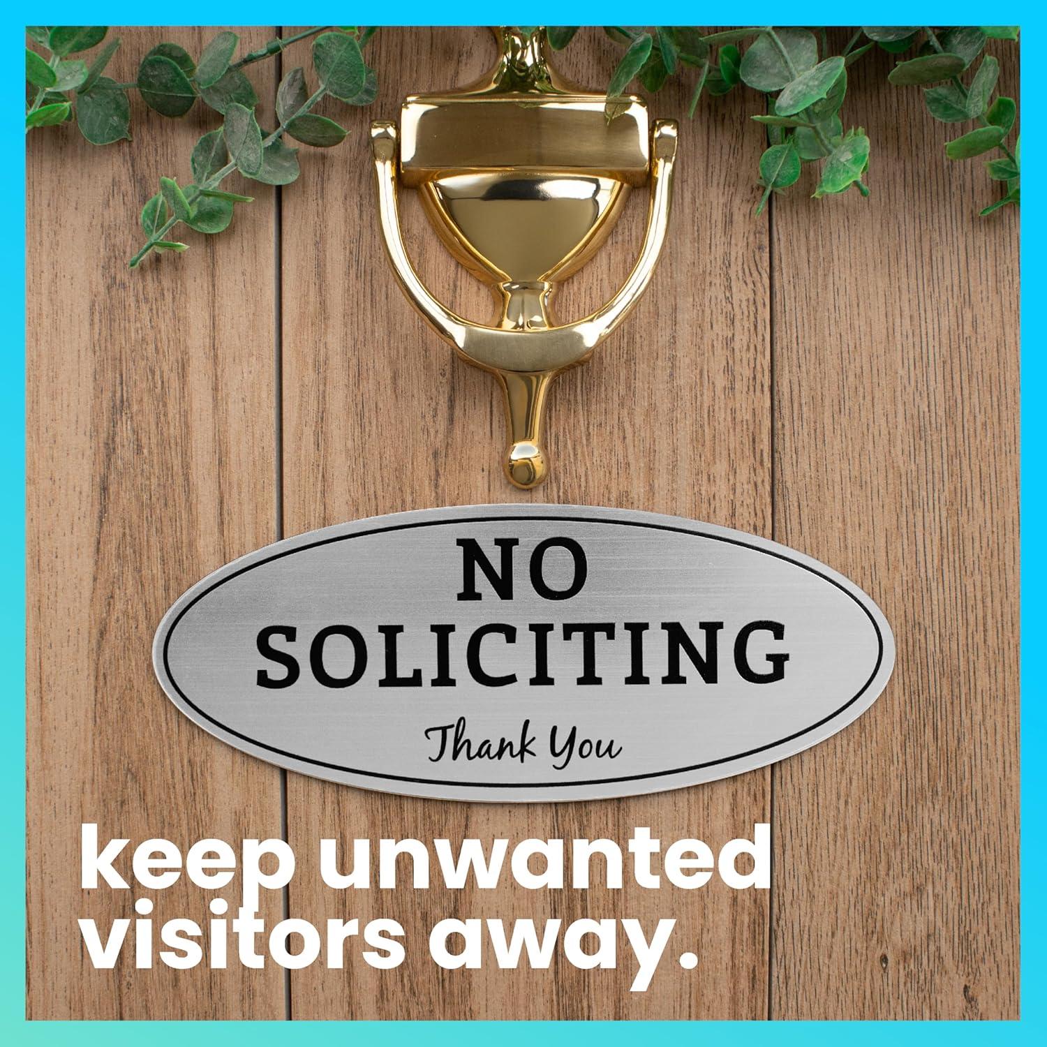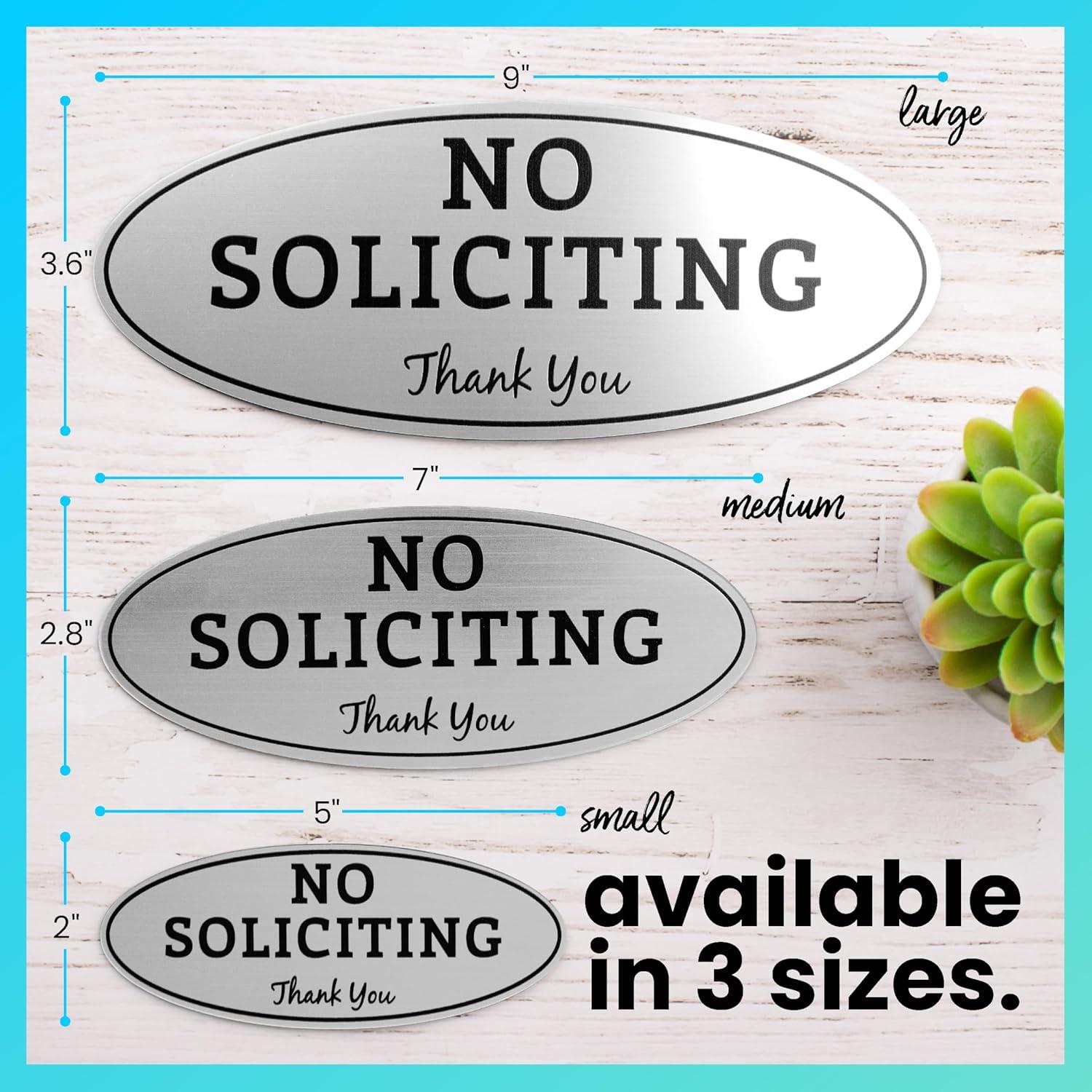 ExcelMark No Soliciting Sign for House or Business – Durable Indoor/Outdoor Sign – Easily Attach to Front Door - UV and Weather Resistant (Small - 2"x 5", Black with Gold Letters)(Silver/Black Oval)