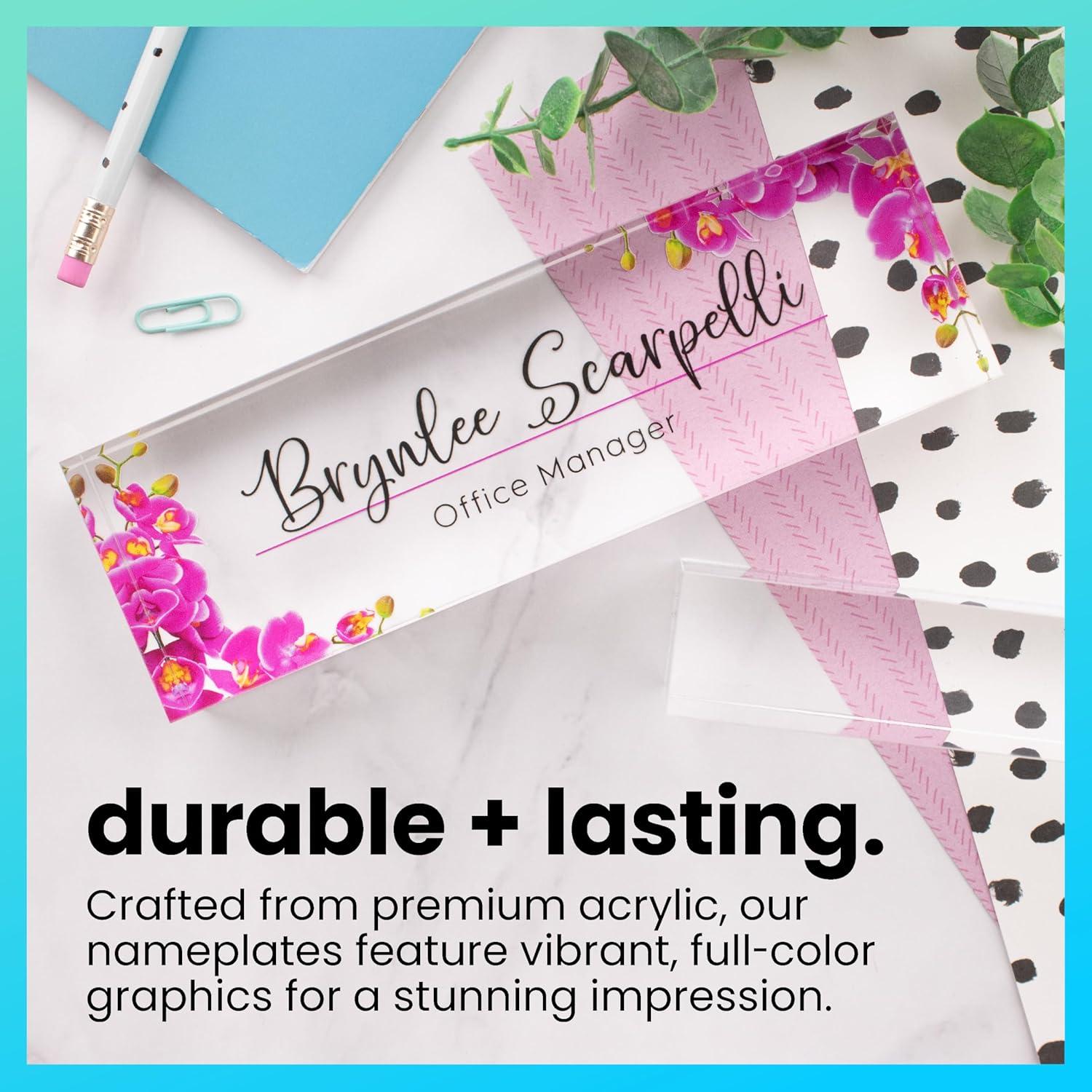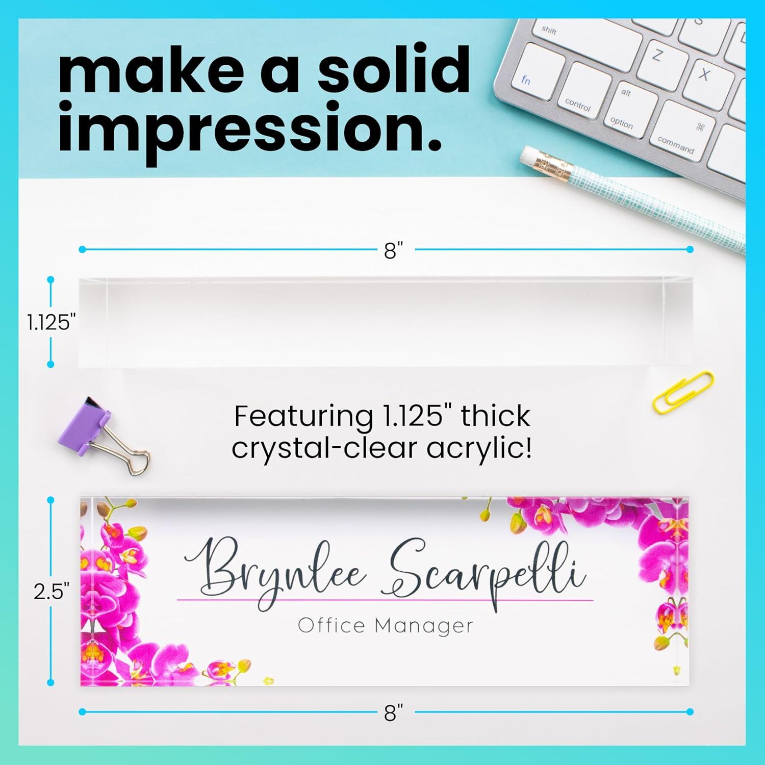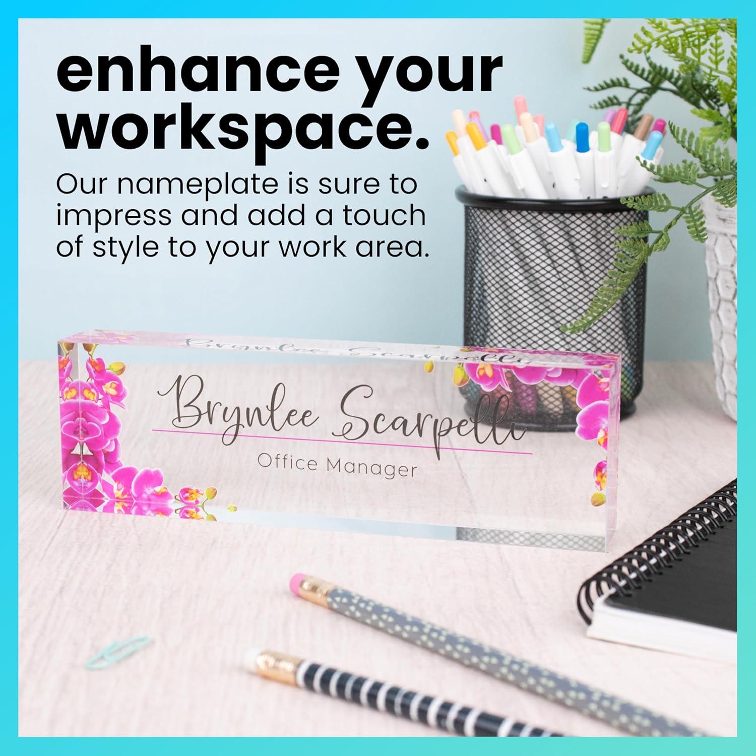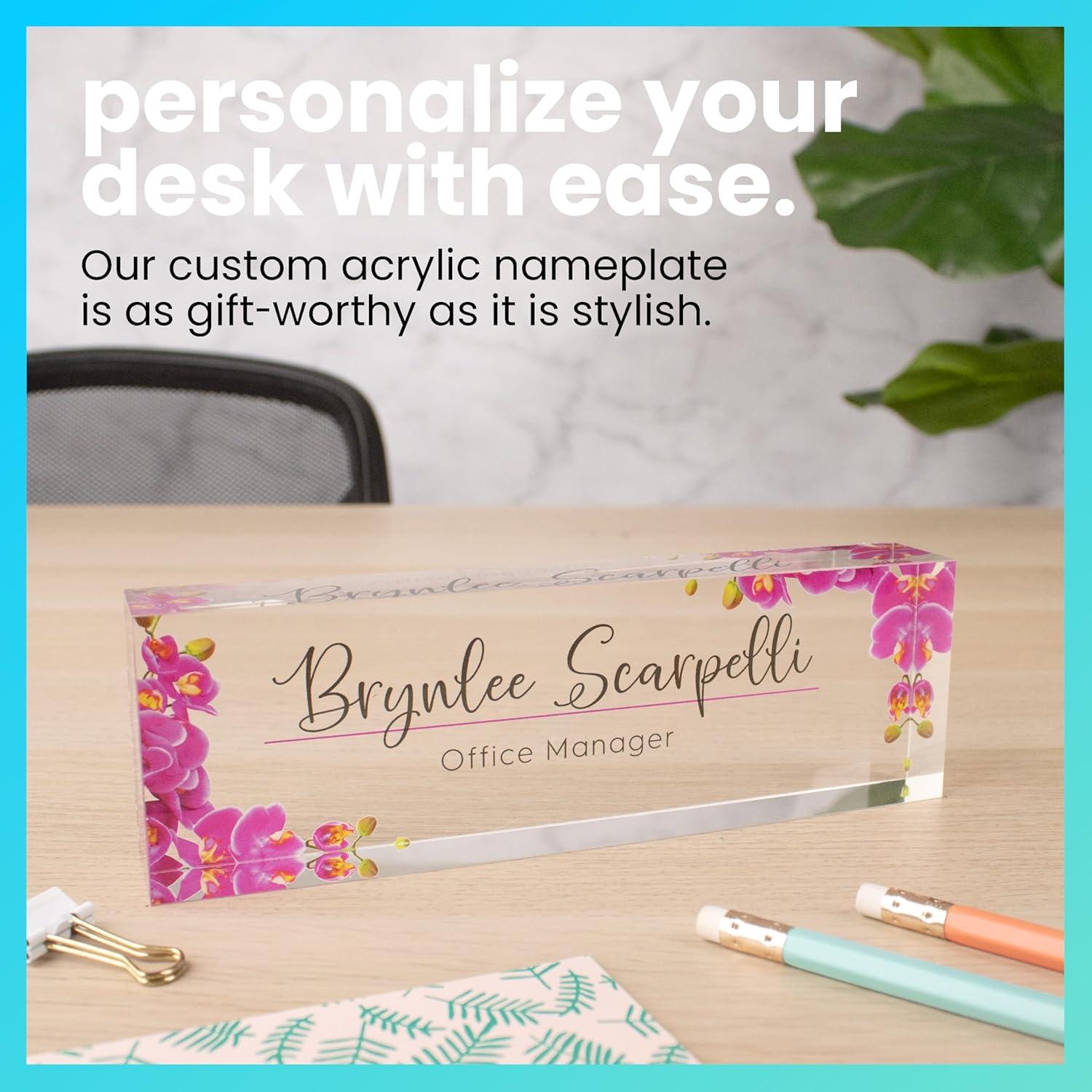 ExcelMark Premium Clear Acrylic Glass Block Unique Designed Name Plates for Your Desk - (8"x2.5") – Orchids(Orchids)