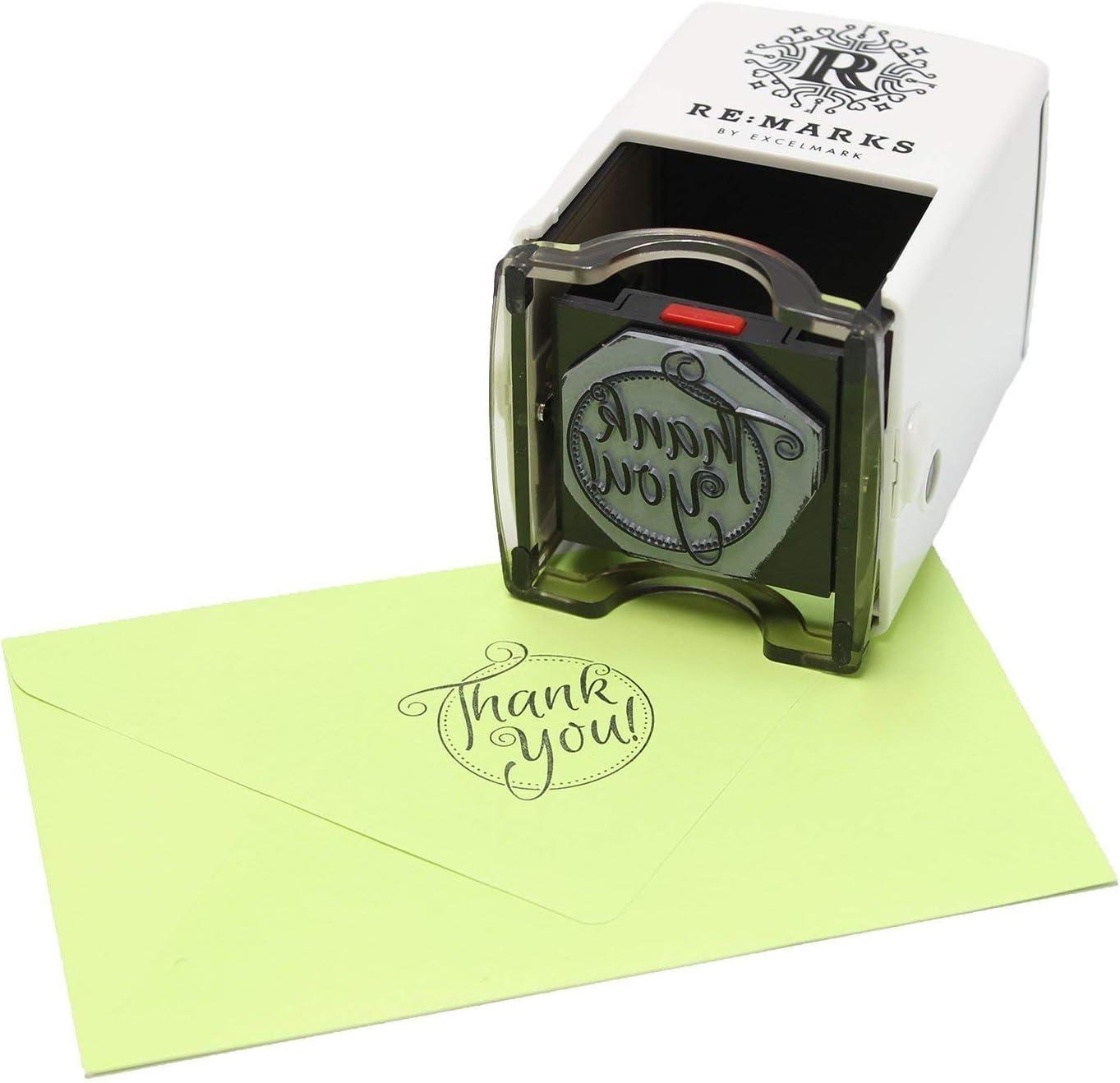 Includes a self-inking stamp mount, customized address die plate, “Thank You!” die plate, and a double-sided black ink pad.
